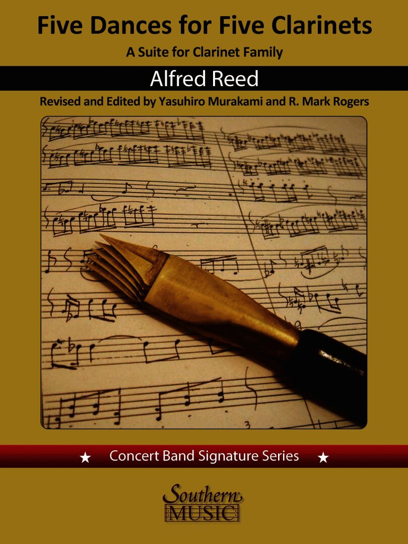 Alfred Reed composed Five Dances for Five Clarinets in 1956 at the request of the LeBlanc instrument company to introduce the performance capabilities and tone of each instrument of the clarinet family. The five movements are based on musical styles from around the world: 1. Hoe-Down (E-flat Soprano Clarinet), 2. Sarabande (E-flat Alto Clarinet or Basset Horn in F), 3. Guaracha (Bass Clarinet), 4. Afro (E-flat Contra Alto or B-flat Contra Bass Clarinet), and 5. Hora (B-flat Clarinet). Previously, the score and parts for Five Dances for Five Clarinets were only available on a rental basis, and Reed had not included the composition in his own list of published works. Yasuhiro Murakami, author of an annotated list of Reeds works, created this edition based on Reed's manuscript.